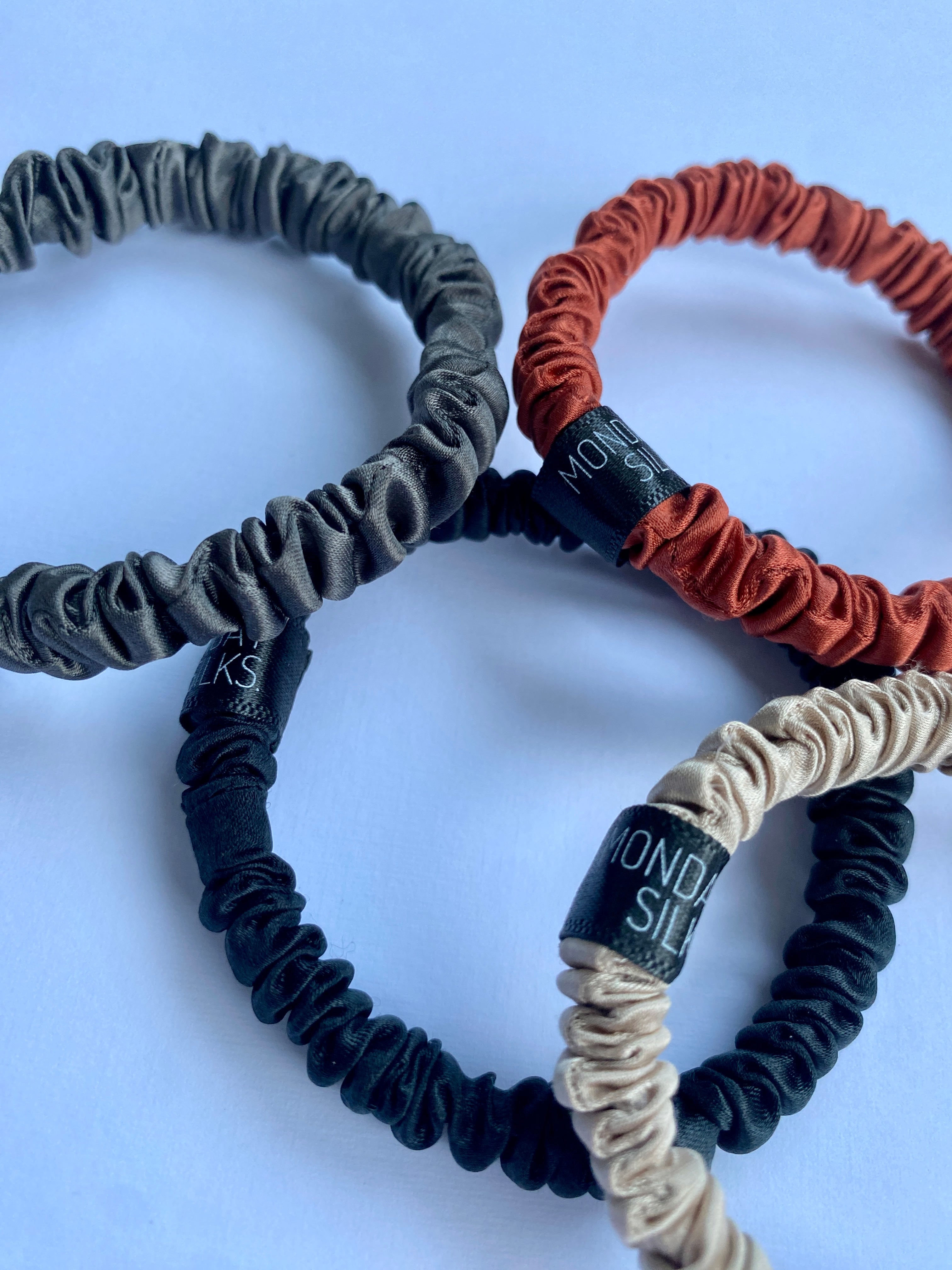 Skinny Silk Scrunchies - 4 Pack (2 black, 1 pink, 1 champagne)
